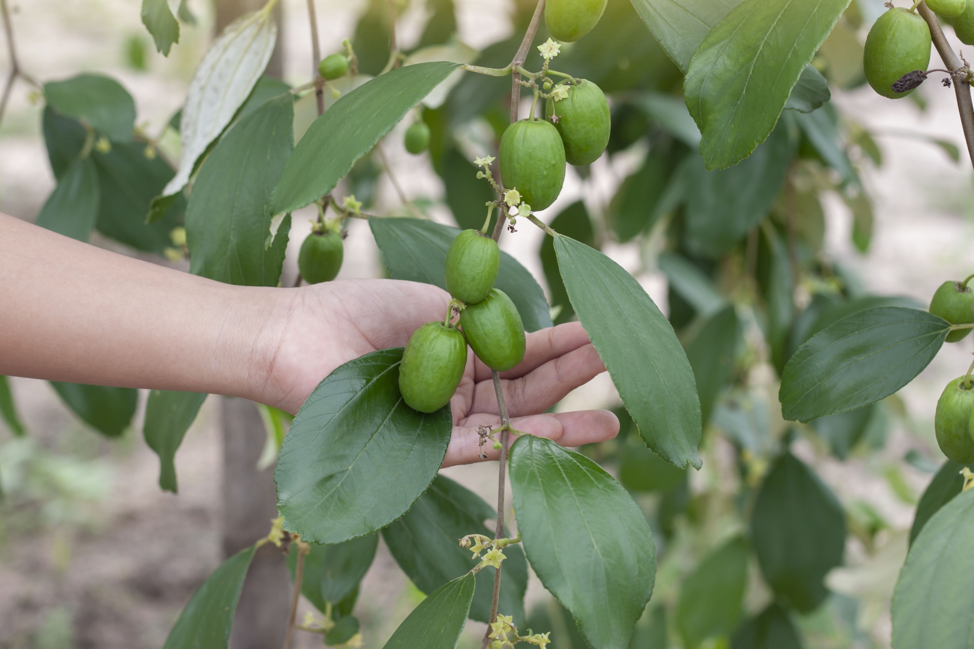 ÁRVORE: É uma árvore de crescimento rápido, que se adapta com facilidade a qualquer tipo de solo até mesmo aos cálcarios de drenagem pobre. Conforme a quantidade de água que receberá, pode manter-se de porte pequeno (em caso de seca) ou crescer até aos 10 metros. A sua copa é arredondada, densa e os seus ramos apresentam espinhos. É parcialmente autofértil, embora produza melhor com polinização cruzada.Apesar de ser originária de climas quentes, a jujubeira resiste a temperaturas negativas, embora perca as folhas no outono em muitas regiões.