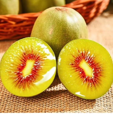 O kiwi Sunshine red destaca-se por possuir uma polpa de coloração verde raiada de vermelho. Com uma casca fina a sua polpa é doce e aromatizada. Necessita de polinização cruzada.