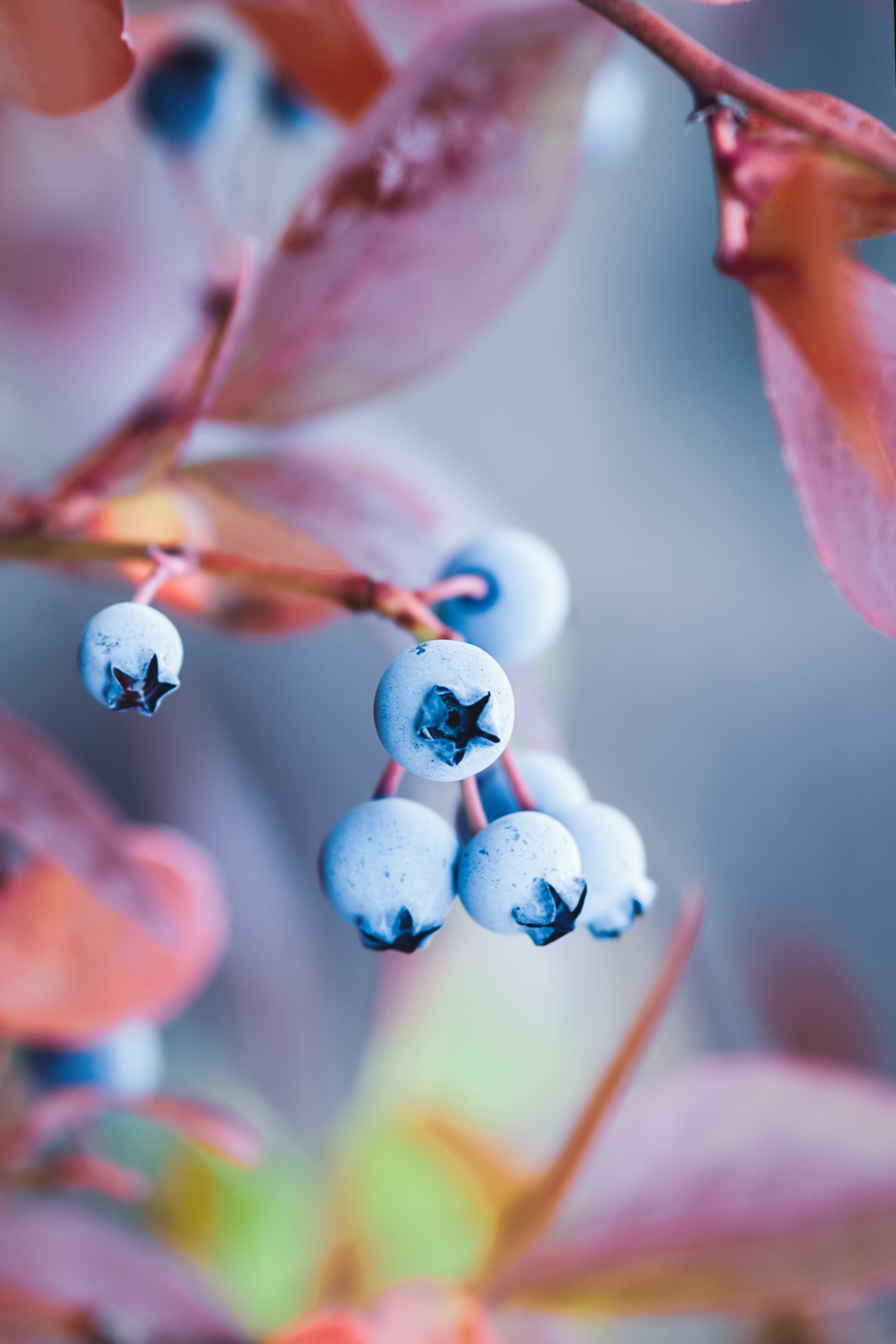 Os mirtilos são arbustos de pequeno porte, o fruto é uma baga que quando madura adquire a coloração azul arroxeada de sabor agridoce.